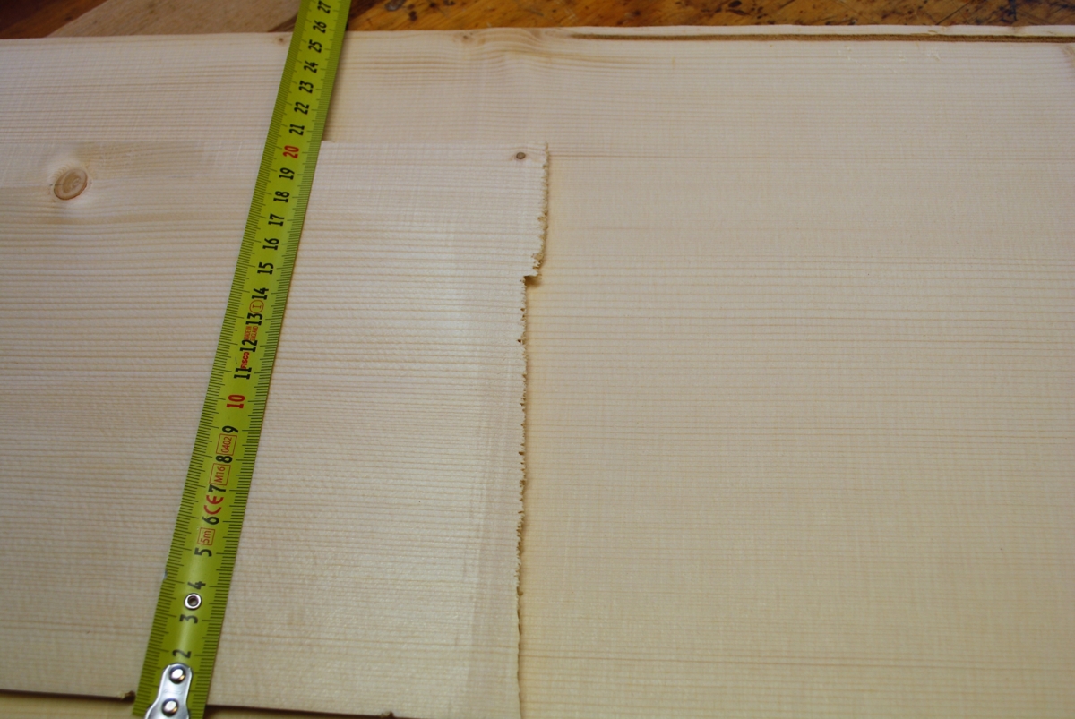 De andre plankene så svært lovende ut. De var skåret fra midten av stokken og var like brede som hele stokken så jeg delte dem i to langs kjernen. Det var tydelig forskjell på den ene og andre siden, den ene siden vendte tydeligvis mer mot sør og var mer hurtigvokst (og ikke så interessant for meg) mens den andre siden lå i motsatt retning og hadde de visuelle egenskaper man forbinder med lokk av god kvalitet: jevn vekst, passe avstand mellom årringer og lite vekst i sommerveden (de mørke ringene). Vi sammenlignet én av disse platene (over) med alpegran fra Val di Fiemme i Italia (under) og det var vanskelig å se forskjellen!